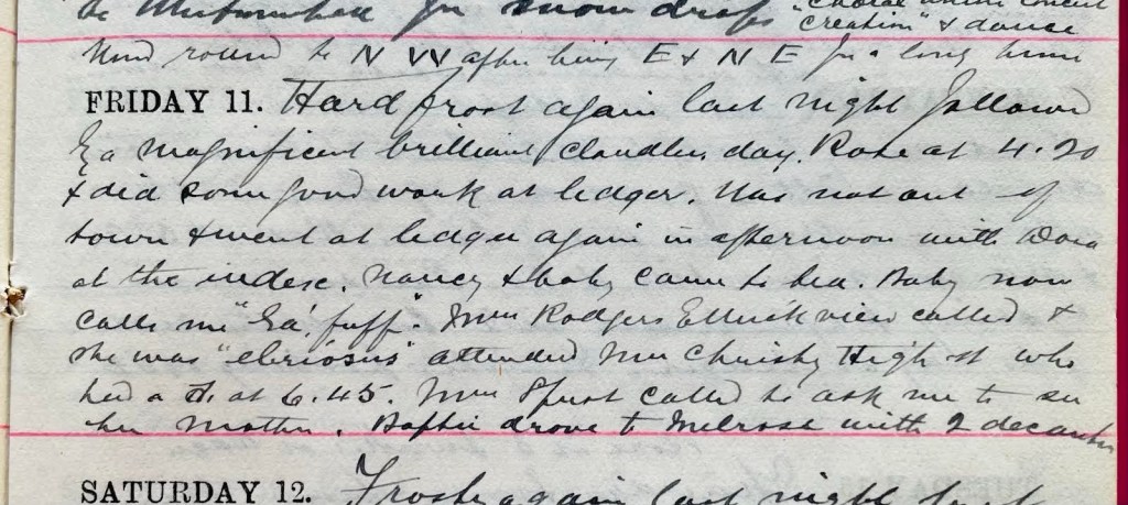Hard frost again last night followed by a magnificent brilliant cloudless day. Rose at 4.20 + did some good work at ledger. Was not out of town + went at ledger again in afternoon with Dora1 at the index. Nancy + baby2 came to tea. Baby now calls me “Ga’ fuff”. Mrs Rodger, Ettrick View3 called + she was “Eliriosus”.4 Attended Mrs Christy, High Street, who had a d [daughter] at 6.45.5 Mrs Sprot called to ask me to see her mother.6 Baptie7 drove to Melrose with 2 decanters.8