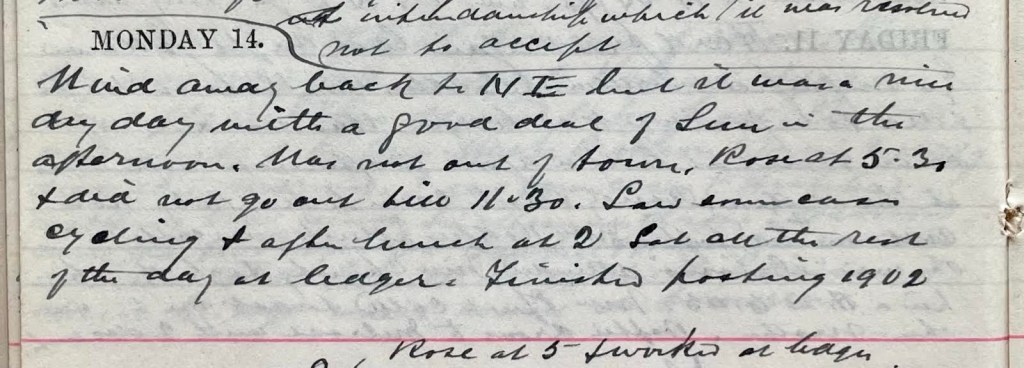 Wind away back to N.E. but it was a nice dry day with a good deal of sun in the afternoon. Was not out of town. Rose at 5.30 + did not go out till 11.30. Saw some cases cycling + after lunch at 2 got all the rest of the day at ledger. Finished posting 1902.