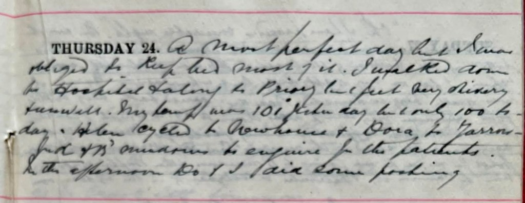 A most perfect day but I was obliged to keep bed most of it. I walked down to Hospital + along to Priory but felt very shivery + unwell. My temp. was 101° yesterday but only 100 today. Helen1 cycled to Newhouse + Dora2 to Yarrowford + Broadmeadows to enquire for the patients in the afternoon. Do. [Dora] + I did some posting [accounts].