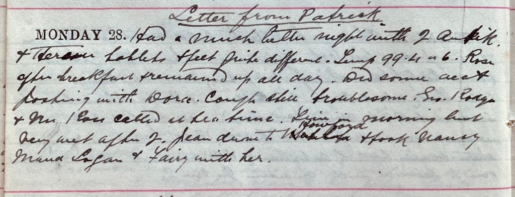 Had a much better night with 2 Ankik + Heroin tablets2 + felt quite different. Temp 99.4 at 6. Rose after breakfast + remained up all day. Did some accounts posting with Dora.3 Cough still troublesome. Geo. Rodger4 + Mr Ross5 called at tea time. Fine in morning but very wet after 2. Jean6 drove to Kirkhope Howford7 + took Nancy,8 Maud Logan9 + Fairy10 with her.