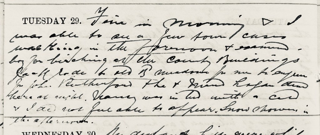 Fair in morning I was able to see a few town cases walking in the forenoon + examined boy for birching at the County Buildings.1 Jack2 rode to Old Broadmeadows for me to enquire for John Rutherford3 + he + Maud Logan4 dined here at night. Nancy5 was in bed with a cold + I did not feel able to appear. Snow showers in the afternoon.
