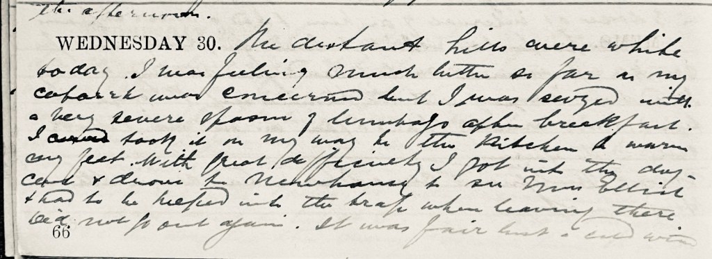 The distant hills were white today. I was feeling much better as far as my catarrh was concerned but I was seized with a very severe spasm of lumbago after breakfast. I took it on my way to the kitchen to warm my feet. With great difficulty I got into the dog-cart1 + drove to Newhouse to see Mrs Elliot2 + had to be helped into the trap when leaving there. Did not go out again. It was fair but a cold wind.