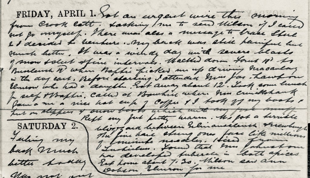 Got an urgent wire this morning from Crook Cottage1 + asking me to send Wilson2 if I could not go myself. There was also a message to Grace [?] Steel3 so I decided to venture. My back was still painful but much better. It was a windy day with severe blasts of snow + sleet + fine intervals. Walked down Forest Road to Buccleuch Road where Baptie4 picked me up driving Macaulay5 in the dog cart.6 Before starting I attended Mrs Jas. Lawton, Elmrow who had a daughter.7 Got away about 12. Took some lunch for self + Baptie. Called at Bowhill where Mrs Cruickshank8 gave a [sic] me a nice hot cup of coffee + I took off my boots + kept my feet pretty warm. We got a terrible blizzard between Gilmanscleuch + Newburgh. The fine hail stung our faces like millions of minute needles. It iced from [?] Tushielaw. Found that Mrs Johnston has developed tubercle in both apices. Got home about 7.30. Wilson saw Ann Dobson, Elmrow9 for me.