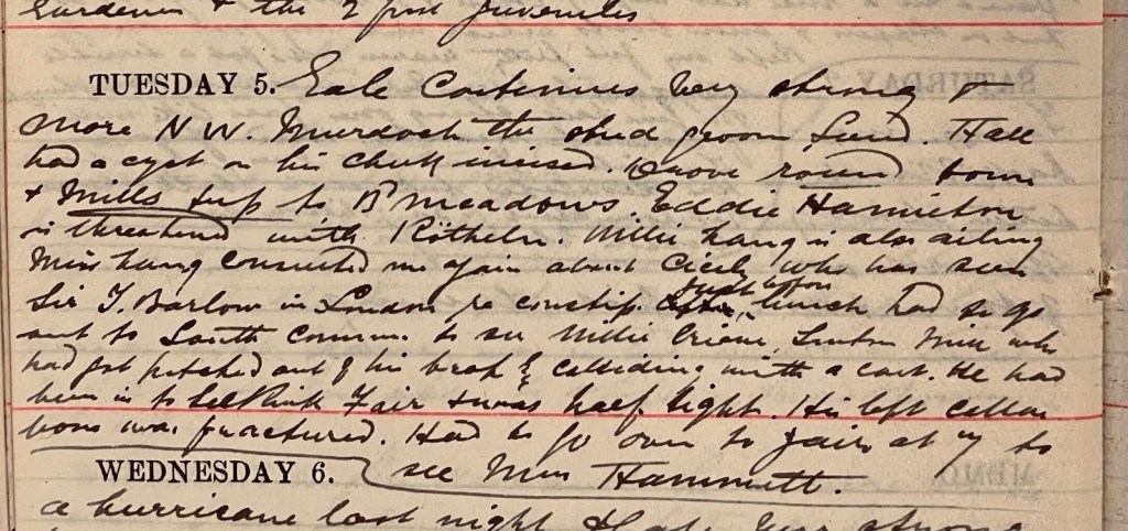 Gale continues very strong + more N.W. Murdoch1 the stud groom Sunderland Hall had a cyst on his cheek incised. Drove round town + mills + up to Broadmeadows. Eddie Hamilton2 is threatened with Rötheln. Willie Lang3 is also ailing. Miss Lang4 consulted me again about Cicely5 who has seen Sir T Barton6 in London re [?]. Right before lunch had to go out to South Common to see Willie Grieve, Sinton Mill7 who had got pitched out of his trap by colliding with a cart. He had been in to Selkirk Fair + was half tight. His left collar bone was fractured. Had to go over to Yair at 7 to see Mrs Hamilton.