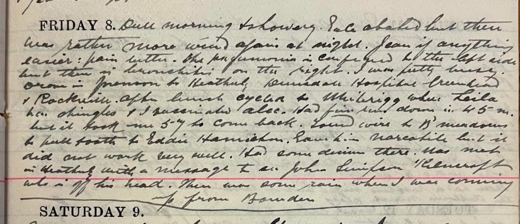 Dull morning + showery. Gale abated but there was rather more wind again at night. Jean1 if anything easier : pain better. The pneumonia is confined to the left side but there is bronchitis on the right. I was pretty busy. Drove in forenoon to Heatherly [sic], Dunsdale, Hospital, Greenhead + Rockville2. After lunch cycled to Whiterigg3 where Leila4 has shingles + I vaccinated also. Had fair run down in 45m but it took me 57 to come back. Found wire to Broadmeadows to pull tooth to Eddie Hamilton.5 Gave him Narcotile [?] but it did not work very well. Had some dinner there. Was met in Heatherly with a message to see John Simpson, Kilncroft, who is off his head.6 There was some rain when I was coming up from Bowden.