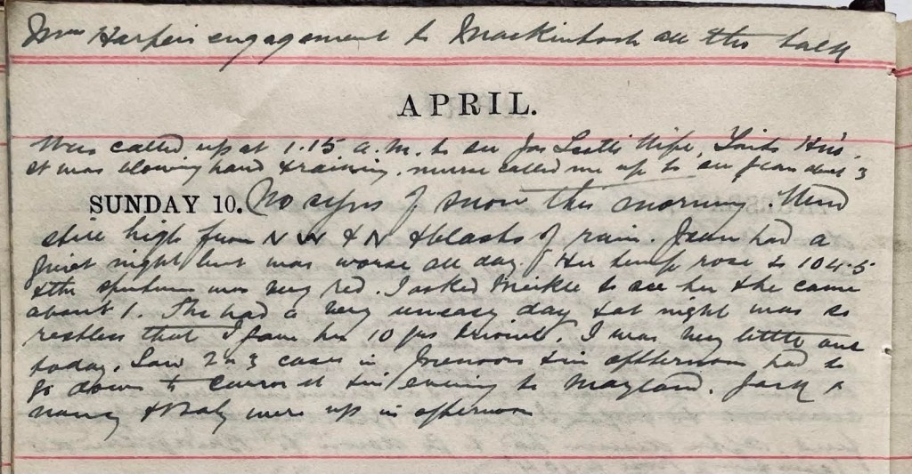 Was called up at 1.15 a.m. to see Jas. Scott’s wife, Tait’s Hill.2 It was blowing hard + raining. Nurse called me up to see Jean3 about [?] 3. No signs of snow this morning. Wind still high from N.W. + N. + blasts of rain. Jean had a quiet night but was worse all day. Her temp. rose to 104.5 + the sputum was very red. I asked Meikle4 to see her + he came about 1. She had a very uneasy day + at night was so restless that I gave her 10 grs trional. I was very little out today, saw 2 – 3 cases in forenoon + in afternoon had to go down to Curror Street + in evening to Maryland.5 Jack + Nancy + Baby6 were up in afternoon.