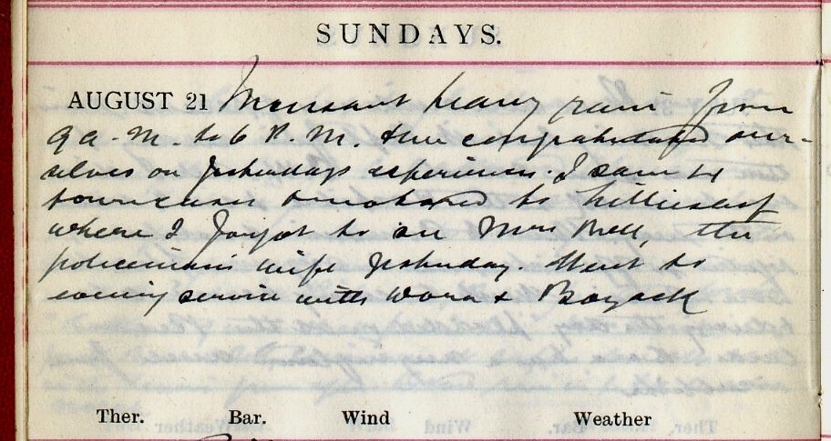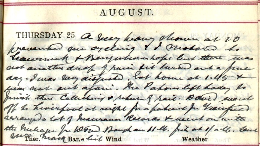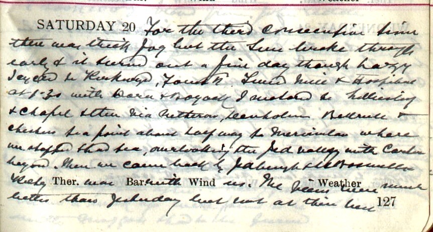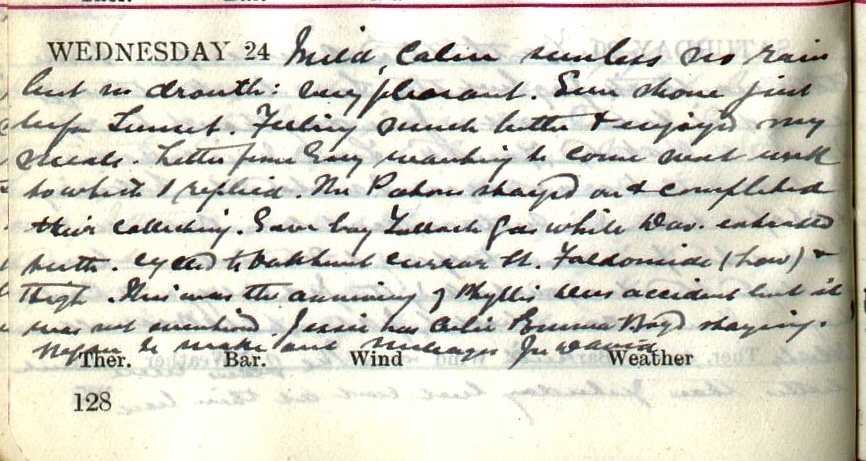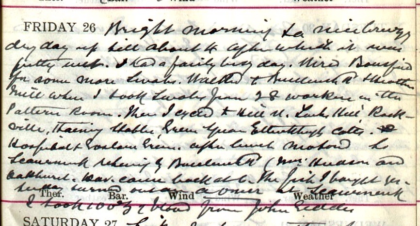 Bright morning + a nice breezy dry day up till about 4 after which it was pretty wet. I had a fairly busy day. Wired Bousfield1 for some more swabs. Walked to Buccleuch Road + Heather Mill where I took swabs from 28 workers in the Pattern Room. Then I cycled to Mill Street, Tait’s Hill, Rockville, Haining Stables, Green Square, Ettrickhaugh Cottages, Hospital + Goslaw Green. After lunch motored to Scaurneuk returning by Buccleuch Road (Mrs Hudson2) + Oakhurst3. Dav.4 came back at 6. The fish I bought yesterday turned out [illegible text]. At Scaurneuk I took 100ʒ of blood5 from John Geddes6.