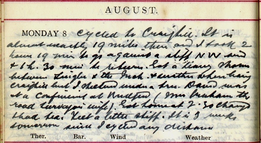 Mild day. S wind: fair up till 2.45 + then very heavy rain till 8 or 9. After seeing some town cases walking I cycled over to Lilliesleaf via Greenhead to see Mrs Bell1 the policeman’s wife whom Dav. attended yesterday at her confinement. I came back via Midlem + was not long home till the rain began. Dora1 had her friend Mrs Douglas Brown (nee Donald)1 + the Smiths1 to lunch. I dined at MCall’s1 with his friend Brown1 + Boylan1. The former a fine singer. McCall surprised me by singing very well “Did you ever see an oyster”1 + Boylan by reciting.