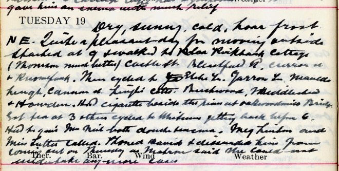 Another fair day + without the fog of yesterday morning. A busy day. Was called at breakfast time to Mrs Henderson1, Goslaw Green who hung on all day but never required me. Cycled in town + to Curror Street, Sloebank2, Dunsdale, Bridge Street, Yair, Bogle House, Faldonside (Jessie3 in Edinburgh), Bleachfield Road + after tea to Howden, Oakwood Mill, Oakwood, Howford Cottage + Beechwood = 321/2 miles + finished quite fresh. Helen4 went with the Wellwooders5 to Picture House. Got a box of lovely grapes from Mrs Baptie (Molly Inglis) from Cape Town6.