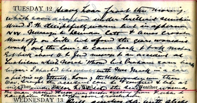 Heavy hoar frost this morning which soon disappeared under brilliant sunshine. Wind S.W. delightfully warm but in afternoon N.W. Message to Dundas Cottage1 + Amos2, Crosslee. Went off on bike but found the gears wouldn’t work, only the low: so came back + took motor. Got back about 4 to find message to an accident at Tushielaw which Norah3 ‘Phoned but Graham4 came back before I started + he went with Mrs Mack5 in a car a picnic up Ettrick6. Some of the Wellwooders7 were there. Dav. brought the accident case to Viewfield + late at night under Chlor[oform] he stitched the scalp wounds. The man named Knox was motor cycling from Peebles to Langholm when he came a cropper above Crossleeburn8.