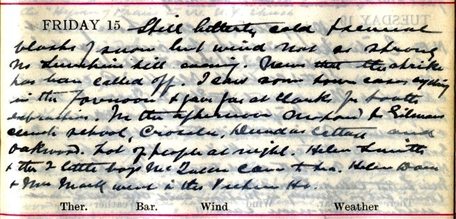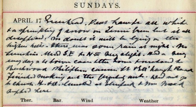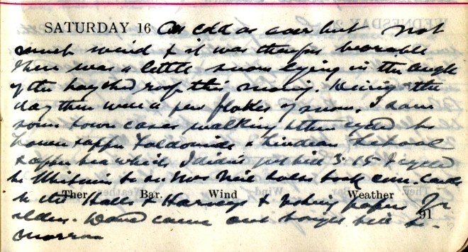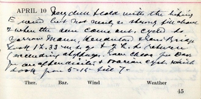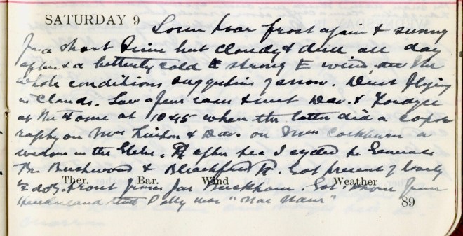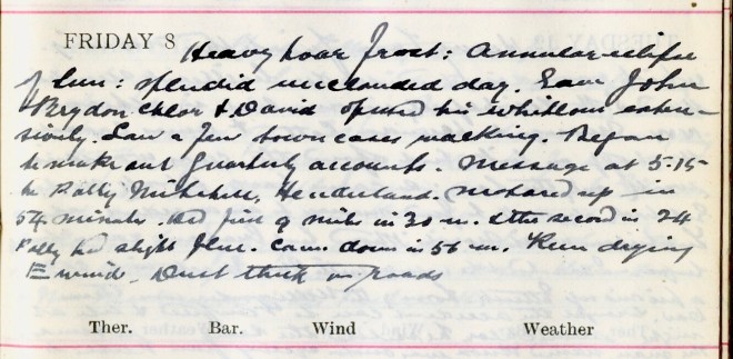 Heavy hoar frost this morning which soon disappeared under brilliant sunshine. Wind S.W. delightfully warm but in afternoon N.W. Message to Dundas Cottage1 + Amos2, Crosslee. Went off on bike but found the gears wouldn’t work, only the low: so came back + took motor. Got back about 4 to find message to an accident at Tushielaw which Norah3 ‘Phoned but Graham4 came back before I started + he went with Mrs Mack5 in a car a picnic up Ettrick6. Some of the Wellwooders7 were there. Dav. brought the accident case to Viewfield + late at night under Chlor[oform] he stitched the scalp wounds. The man named Knox was motor cycling from Peebles to Langholm when he came a cropper above Crossleeburn8.