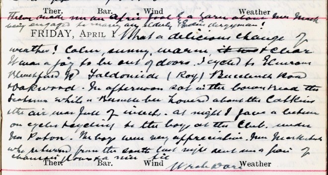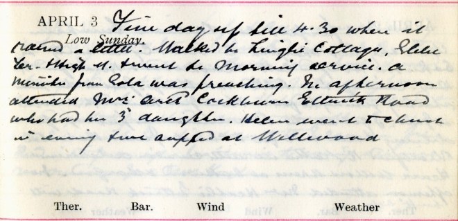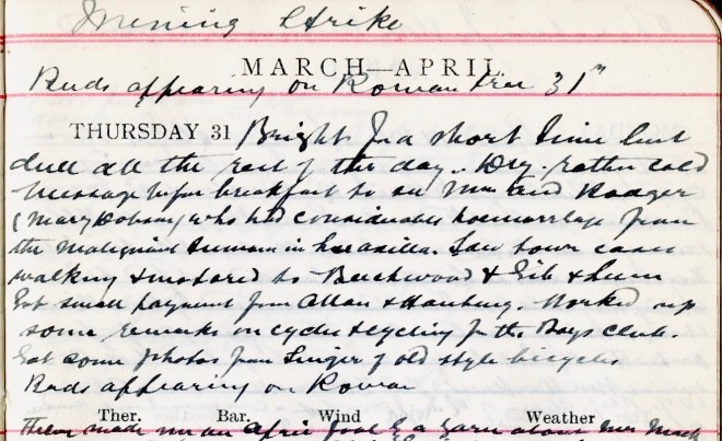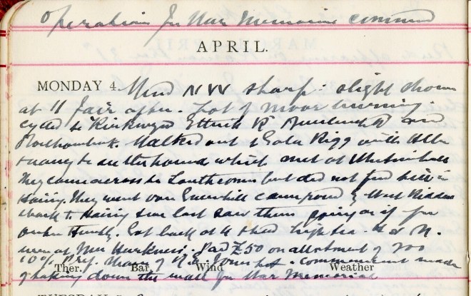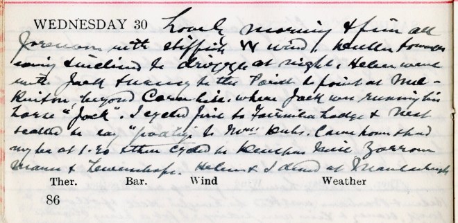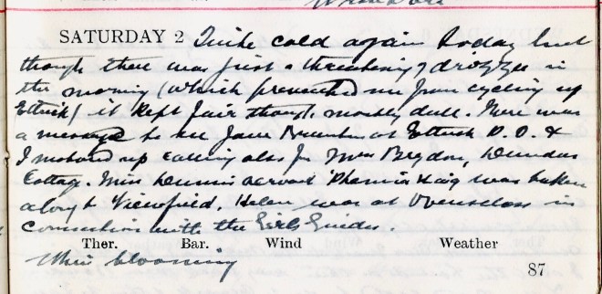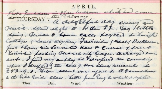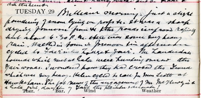 Wind went round by S. to E. it was much warmer with a good amount of sunshine up till 3 + 4. Saw some town cases cycling + walking. Left at 12.30 + cycled to Low Faldonside. Meant to go on to call for Jessie Boyd1 but met her cycling up to lunch at Mauldsheugh. Went on via Gattonside to meeting of Div. at Newtown2. There were 13 present including Blair’s3 successor, Elliot4 + McLagan5 of Ayton. It was delightful cycling + the County quite spring like. Helen6 motored with Mrs Mack7 to the meet at Bowhill. I met the hounds on their way back near Bowden Toll8. David9 cycled today to Newark + then to Fairnilea.