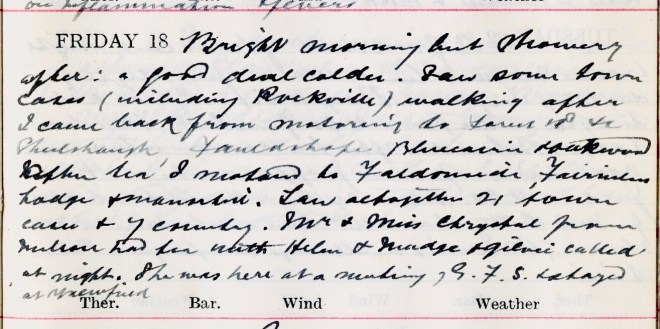 Bright morning but showery after: a good deal colder. Saw some town cases (including Rockville1) walking after. I came back from motoring to Forest Road +c Shielshaugh, Fauldshope, Bluecairn + Oakwood. After tea I motored to Faldonside, Fairnilee Lodge + Manorhill2. Saw altogether 21 town cases + 7 county. Mr + Miss Chrystal3 from Melrose had tea with Helen4 + Madge Ogilvie5 called at night. She was here at a meeting of G.F.S.6 + stayed at Viewfield7.