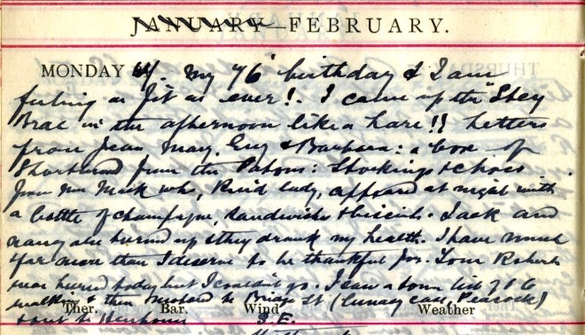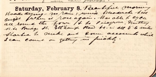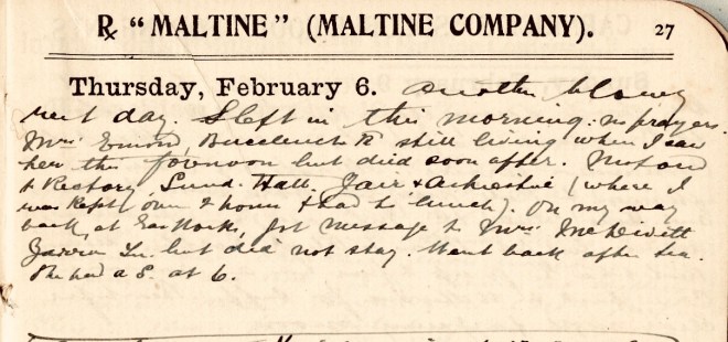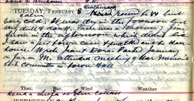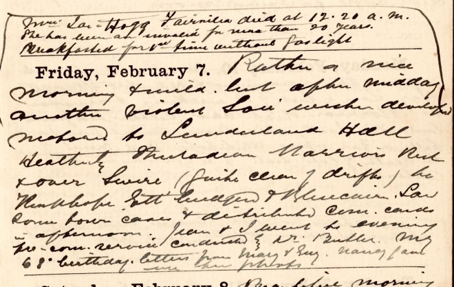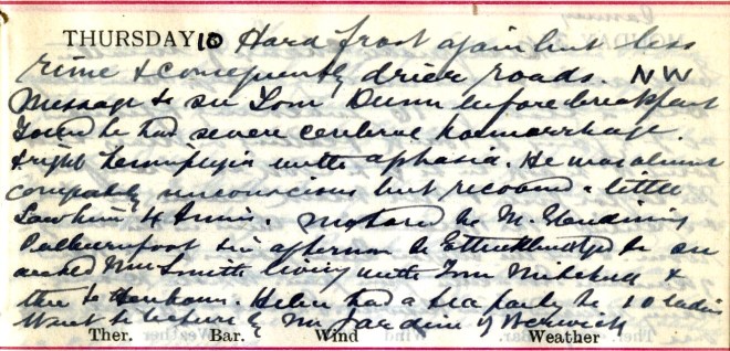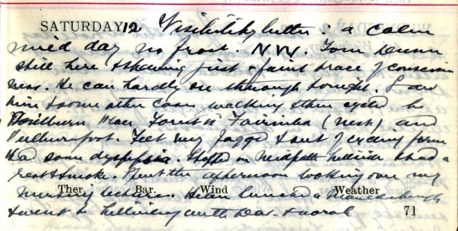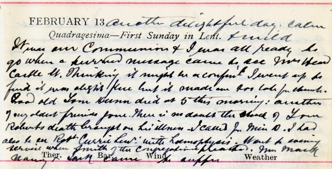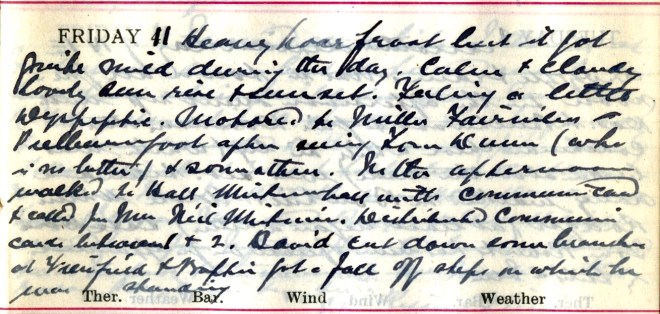 Another delightful day. Calm + mild. It was our Communion + I was all ready to go when a hurried message came to see Mrs Heard1, Castle Street. Thinking it might be a confint I went up to find it was alright there but it made me too late for church. Poor old Tom Dunn2 died at 5 this morning: another of my oldest friends gone. There is no doubt the shock of Tom Roberts’ death3 brought on his illness. I called for Miss D.4 I had also to see Robert Currie Sen.r5 with haemoptysis. Went to evening service where Smith of the Congregational6 preached. Mrs Mack7, Nancy + Jack8 came to supper.