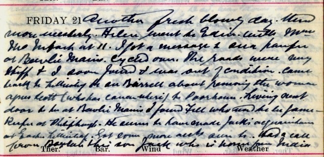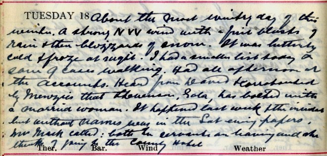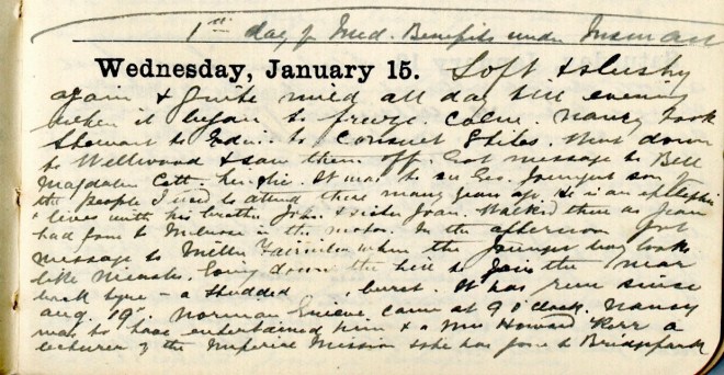 Soft + slushy again + quite mild all day till evening when it began to freeze. Nancy2 took Stewart3 to Edin. to consult Stiles4. Went down to Wellwood + saw them off. Got message to Bell5, Magdalen Cottage, Linglie. It was to see George, youngest son of the people I used to attend there many years ago6. He is an epileptic + lives there with his brother John + sister Joan7. Walked there as Jean8 had gone to Melrose in the motor. In the afternoon got message to Miller, Fairnilee9 where the younger boy looks like measles. Going down the hill to Yair the near back tyre – studded [word missing], burst. It has run since Aug. 19th. Norman Grieve10 came at 9 O’clock. Nancy was to have entertained him + a Mrs Howard Kerr11, a lecturer of the Imperial Mission + she has gone to Bridgepark12.
