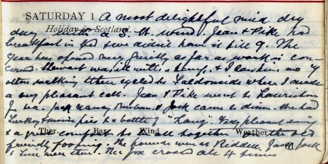 Torrential rain during last night. Roads washed + much cleaner. Flooding at Dunsdalehaugh. Ettrick [Water] very heavy. Kept fair during the day. Saw 14 cases cycling + went to Bridgelands (Mrs Paterson1) intending to go out to Faldonside but at the Railway Bridge, on trying to ride through the pool under the bridge, I had to dismount up to my knees in water + therefore turned home. Met Will. Bowden2 + Mrs Milne3. Mousey4 seedy + has cystitis for which I gave her Urotropine. Along with Jack, Nancy, Barb. + Jock5 I motored to supper with the Patons6.