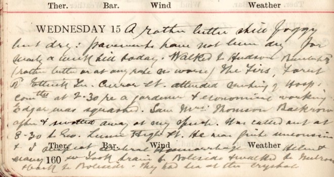 Was called out at 3.30 a.m. to Mrs Marshall1, Beechbank. Sandie2, who came in for me said she was “nearly dead”. However she was not so very ill + some brandy had a good effect. Saw her during the day + at night. There was a slight fall of snow + the ground was all white. It thawed calmly during the day + had almost disappeared at night when it was quite mild. Motored to Faldonside + was disgusted to meet Mrs D.3 coming out of the gate in the car. Called at Wellwood + got Helen’s4 present. Sent away one or two more letters (Isa Boucher5, Vera Brown6). Bella7 still ill in bed. Smith the night nurse from Viewfield called for Helen + kindly came in, scrubbed the kitchen floor + blacked the grate. Helen entertained her to cake + Port.
