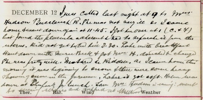 I was called last night at 9 to Mrs Hudson, Buccleuch Road. She was very ill so I came home + went down again at 11.45. I got her over1 at 1 (C. + F.2) but found the placenta adherent + had to separate it from the uterus. Did not get to bed till 3.30. Late with breakfast. Went down with Nurse Beck3 + got Mrs H douched + changed. She was pretty well. Motored to Riddell4. As I came home this morning it was beginning to snow + there were some heavy showers of snow in the forenoon. Later it got soft. Helen5 was down at Elmpark6 for lunch. Saw Mrs Hudson in evening: went to evening service + supped at Wellwood7.