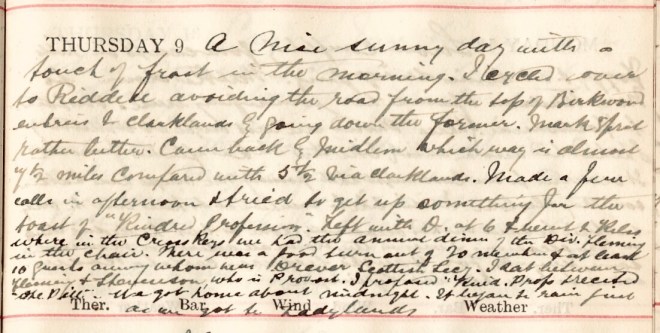 A nice sunny day with a touch of frost in the morning. I cycled over to Riddell avoiding the road from the top of Birkwood entries to Clarklands [sic] by going down the former1. Mark Sprot2 rather better. Came back by Midlem which way is almost 7 ½ miles compared with 5 ½ via Clarklands. Made a few calls in afternoon + tried to get up something for the toast of “Kindred Profession”. Left with D. [David Graham] at 6 + went to Kelso where in the Cross Keys we had the annual dinner of the Div. Fleming3 in the chair. There was a good turnout of 20 members + at least 10 guests, among whom was Drever4, Scottish Secretary. I sat between Fleming + Stevenson5, who is Provost. I proposed “Kind. Profs.” + recited The Pill6. We got home about midnight. It began to rain first as we got to Ladylands.