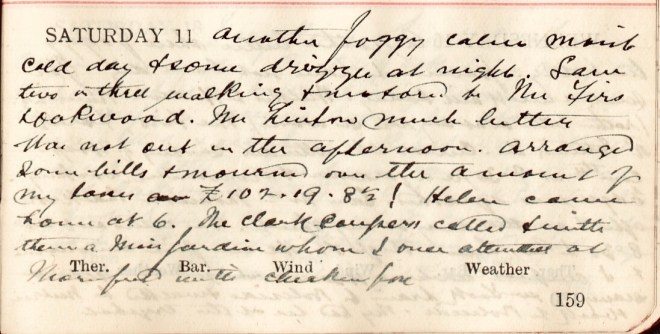 Another foggy calm moist cold day + some drizzle at night. Saw two or three walking + motored to the Firs1 + Oakwood. Mr Linton2 much better. Was not out in the afternoon. Arranged some bills + mourned over the amount of my taxes £102.19.8 ½ ! Helen3 came home at 6. The Clark Coupers4 called + with them a Miss Jardine5 whom I once attended at Thornfield with chicken pox.