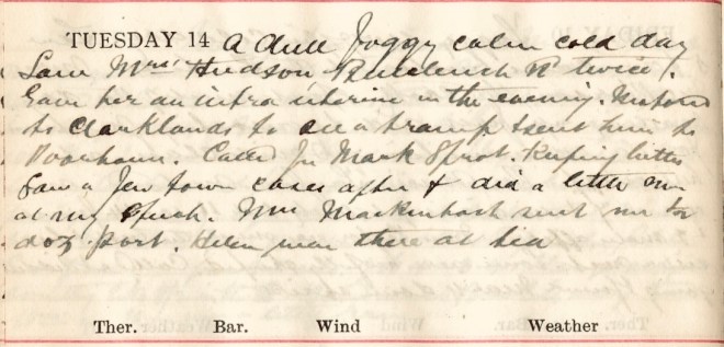 A dull, foggy, calm, cold day. Saw Mrs Hudson1, Buccleuch Road twice. Gave her an intra uterine in the evening. Motored to Clarklands2 [sic] to see a tramp + sent him to Poorhouse. Called for Mark Sprot3, keeping better. Saw a few town cases after + did a little more at my speech. Mrs Mackintosh4 sent me ½ doz. Port. Helen5 was there at tea.