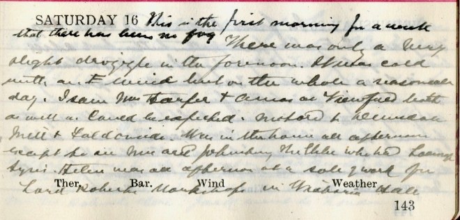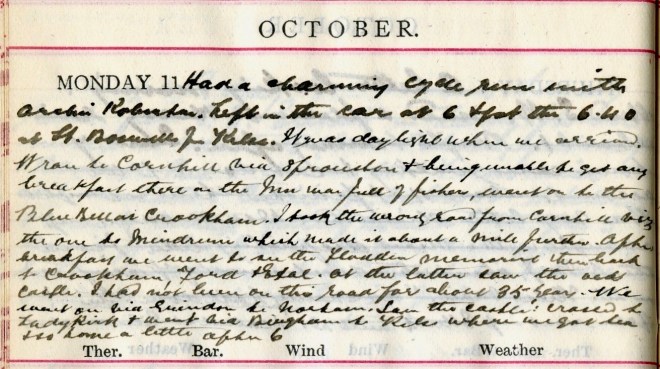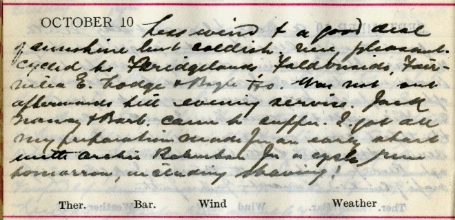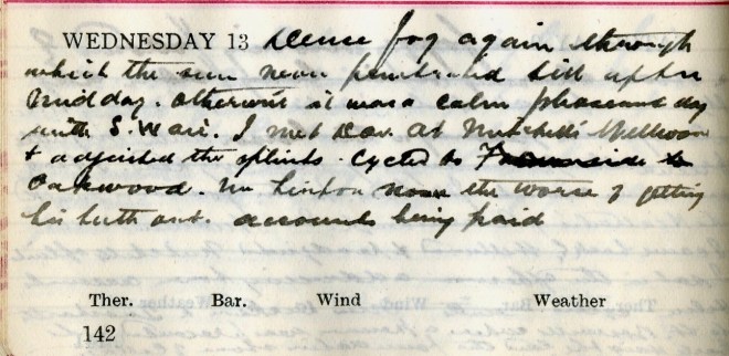 Dense fog again through which the sun never penetrated till after midday. Otherwise it was a calm, pleasant day with S.W. air. I met Dav. [Graham] at Mitchell’s, Wellwood + adjusted the splints1. Cycled to [Faldonside deleted] Oakwood. Mr Linton2 none the worse of getting his teeth out. Accounts being paid.
