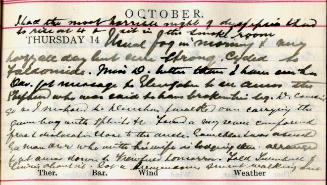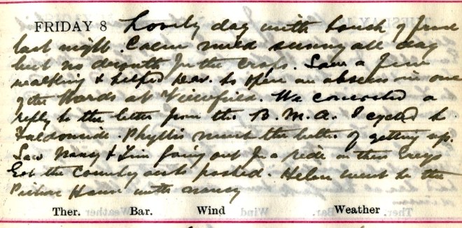 Usual fog in morning + very hazy all day but sun strong. Cycled to Faldonside. Miss D.1 better than I have seen her. Dav. [Graham] got message to Glengaber to see Amos2 the shepherd who was said to have broken his leg. D. [Dr David Graham, co-partner] couldn’t go so I motored to Deuchar + walked over carrying the game bag with splints &c. Found a very severe compound frac[ture] + dislocation close to the ankle. Gave chlor[orform] + was assisted by a man [illegible] who with his wife is lodging there. Arranged to get Amos down to Viewfield tomorrow. Told Turnbull3 of Tinnis about it. Got a tremendous sweat walking down.