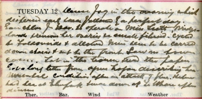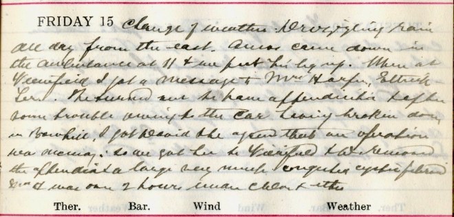 Change of weather. Drizzling rain all day from the east. Amos1 came down in the Ambulance at 11 + we put his leg up. When at Viewfield got a message to Mrs Harper2, Ettrick Terrace. She turned out to have appendicitis + after some trouble owing to the car having broken down at Bowhill, got David + he agreed that an operation was necessary so we got her to Viewfield + D. removed the appendix + a large very much irregular cystic fibroid. Mrs H. was over 2 hours under chlor[orform] + ether.
