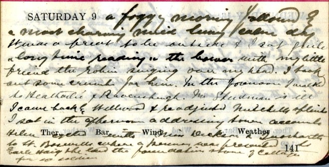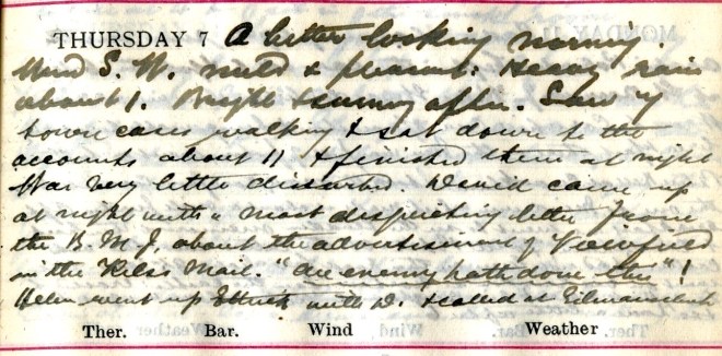 A better looking morning. Wind S.W., mild + pleasant: Heavy rain about 1. Bright + sunny after. Saw 7 town cases walking + sat down to the accounts about 11 + finished them at night. Was very little disturbed. David [Graham] came up at night with a most disquieting letter from the B.M.J.1 about the advertisement of Viewfield in the Kelso Mail. “Our enemy hath done this”! Helen [Muir] went up Ettrick with D. [David Graham, co-parner] + called at Gilmanscleuch.