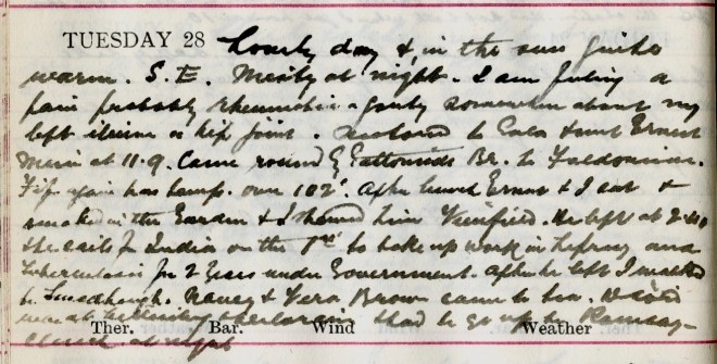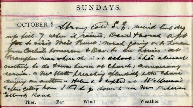 Strong cold S.E. wind but dry up till 7 when it rained. David + Norah1 left to visit Miss Beust2: Norah going on to London from Carlisle tomorrow + Dav. to see Louise3 at Brampton near where she is at school. I had almost nothing to do + was twice at Church: …. Services. A Mr Watt preaching splendidly + the choir singing an anthem. Helen + I supped at Wellwood + after getting home I had to go down to see Mrs Paterson4, Ettrick Road.