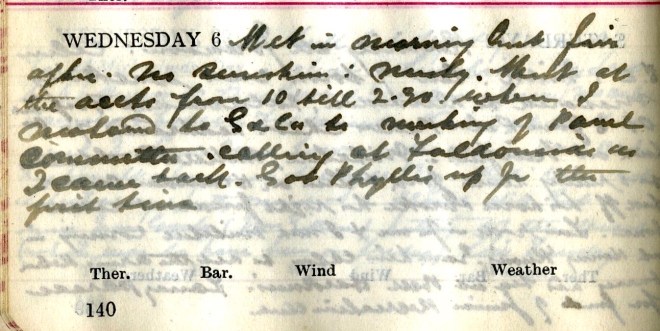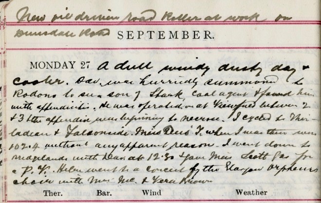 A dull windy dusty day + cooler. Dav. was hurriedly summoned to Rodono to see a son of Stark1, coal agent + found him with appendicitis. He was operated on at Viewfield between 2 + 3 + the appendix was beginning to necrose. I cycled to Thirladean + Faldonside. Miss Dees’ T. [temperature] was 102.4 without any apparent reason2. I went down to Bridgelands with Dav. at 12.30 + gave Miss Scott3 gas for a P.Y. Helen [Muir] went to a concert by the Glasgow Orpheus Choir4 with Mrs Mc.5 + Vera Brown6.