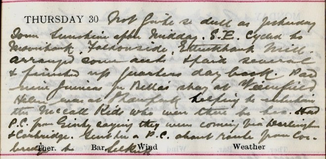 Not quite as dull as yesterday [and] some sunshine after midday. [Wind] S.E. Cycled to Mavisbank, Faldonside, Ettrickbank Mill. Arranged some accounts + paid several + finished up quarter’s day book. Paid 9 Guineas for Bella’s1 stay at Viewfield. Helen was at Shawpark helping to entertain the McCall kids2 who were there to tea. P.C. from Girty3 saying they were coming via Darlington + Corbridge. Sent them a P.C. [postcard] about route from Corbridge to Selkirk.