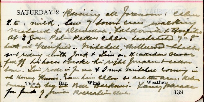 Raining all forenoon: calm [wind] S.E. mild. Saw 7 town cases walking. Motored to Dunsdale, Faldonside + Hospital. At 3 gave Peter Peden1 chlor[orform] + extracted 7 or 8 teeth at Viewfield. Mitchell, Wellwood Stables2 out riding with Jock + Tim3 on Headshaw Moor4 fell off his horse + broke his right forearm + collar bone. Tim rode in for me + I met Mitchell coming in at Henny Knowes. Gave him chlor[orform] + set the arm. Helen + Nancy5 had tea at Bell Harkness’6. Fancy parade for funds of Junior Recreation Club.