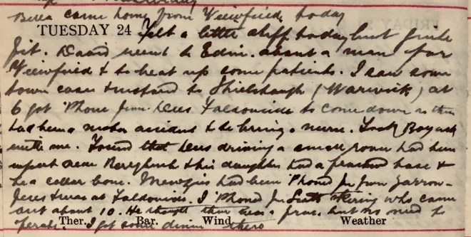 1 Phyllis Mary ‘Fiff’ Dees (1899-1920) had suffered a head injury in a car accident 24 August 1920; she was the daughter of Robert Irwin Dees (1872-1923) and Edith Mary Boileau Dees née Henderson, the new (1920) tenants at Faldonside