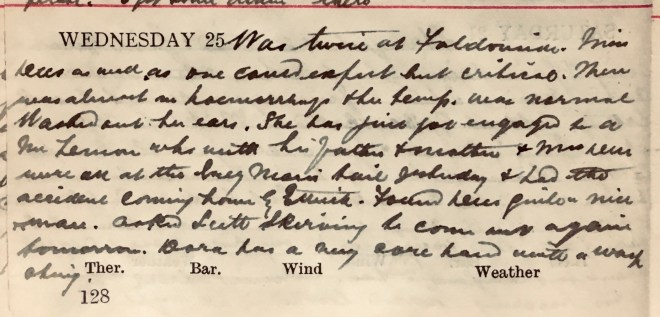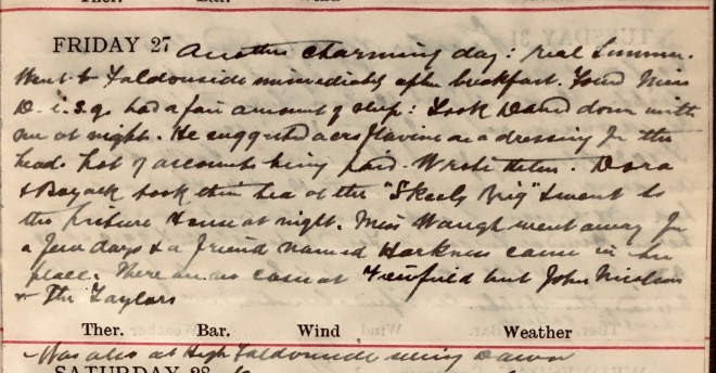 Another charming day: real summer. Went to Faldonside immediately after breakfast. Found Miss D. [Dees1] i.s.q.2 [and] had a fair amount of sleep. Took David down with me at night. He suggested an acriflavine3 as a dressing for the head. Lot of accounts being paid. Wrote Helen4. Dora5 + Boyack6 took their tea at the “Skeely Brig”7 + went to the Picture House at night. Miss Waugh8 went away for a few days + a friend called Harkness came in her place. There are no cases at Viewfield but John Nicolson9 + the Taylors10.