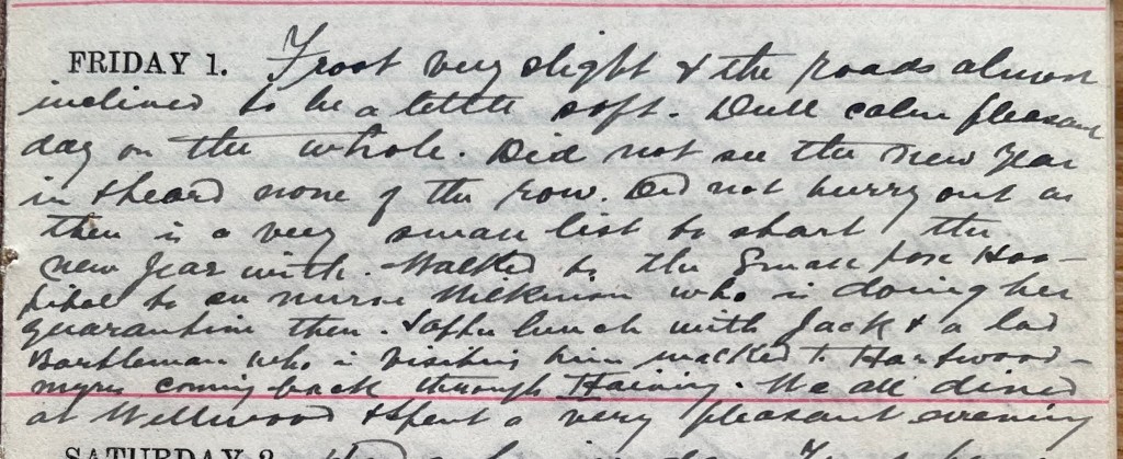Frost very slight + the roads almost inclined to be a little soft. Dull calm pleasant day on the whole. Did not see the new year in + heard none of the row. Did not hurry out as there is a very small list to start the New Year with. Walked to the smallpox hospital to see Nurse Wilkinson who is doing her quarantine there. After lunch with Jack + a lad Bartleman who is visiting him. Walked to Hartwoodmyres coming back through Haining. We all dined at Wellwood + spent a very pleasant evening.