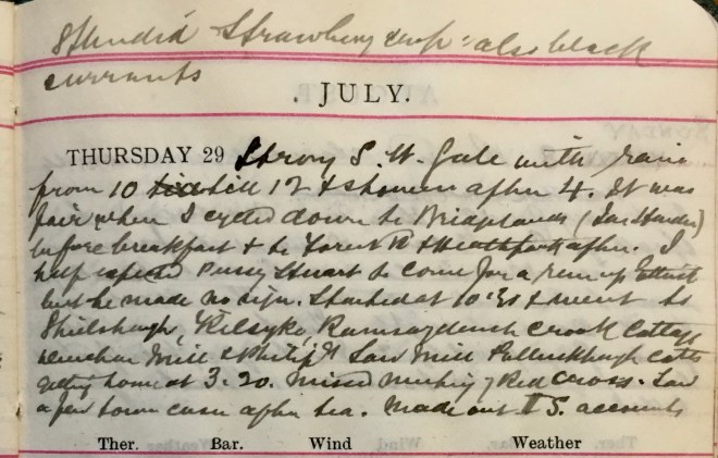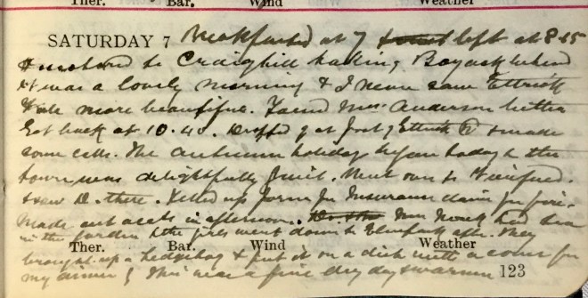 Breakfasted at 7 left at 8.15 + motored to Craighill taking Boyack1 behind2. It was a lovely morning + I never saw Ettrick Vale more beautiful. Found Mrs Anderson3 better. Got back at 10.40. Dropped off at foot of Ettrick Road + made some calls. The autumn holiday began today + the town was delightfully quiet. Went over to Viewfield + saw D. [David Graham, co-partner] there. Filled up form for insurance claim for fire4. Made out accounts in afternoon. Mrs Mack5 had tea in the garden + the girls went down to Elmpark after. They brought up a hedgehog + put it on a dish with a cover for my dinner! This was a fine day, dry + warm.