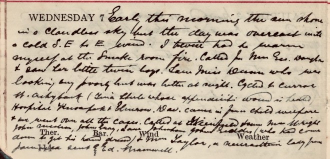 Early this morning the sun shone in a cloudless sky but the day was overcast with a cold S.E. to E. wind. I twice had to warm myself at the Smoke room fire. Called for Mrs Geo. Douglas + saw her little twin boys1. Saw Miss Dunn2 who was looking very poorly but was better at night. Cycled to Curror Street, Ashybank (Tina Steele3, whose appendicitis wound is healed), Hospital, Knowepark + Elmrow. Dav. [Graham] came in from child welfare + we went over all the cases. Called at Viewfield + saw Miss Wright, John …, John Gray, Jane Johnstone, John Geddes (who had come down to get his hand dressed) + Mrs Taylor, a Newcastleton lady from Fairnilee [?] sent by Ed. Bramwell4.