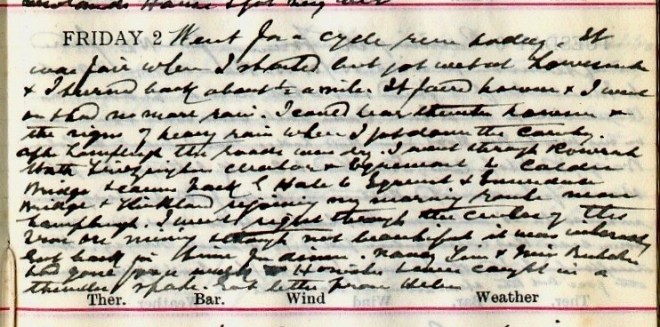 Went for a cycle run today. It was fair when I started but got wet at Loweswater + I hurried back about 1/2 mile. It faired however + I went on + had no more rain. I could hear thunder however + the signs of heavy rain when I got down the country. After Lamplugh the roads were dry. I went through Rowrah, Wath, Frizington, Cleator + Egremont to Calder Bridge + came back by Hale [sic], [illegible], Ennerdale Bridge + Kirkland rejoining my morning route near Lamplugh1. I went right through the centre of the Iron Ore mining2 + although not beautiful it was interesting. Got back in time for dinner. Nancy, Tim [Roberts] + Miss Butcher had gone for a walk [to] Honister + were caught in a thunder spate. Got letter from Helen [Muir].