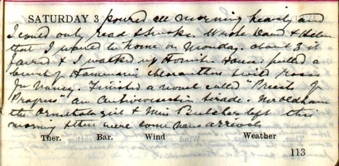 Poured all morning heavily and I could only read + smoke. Wrote David + Helen that I would be home on Monday. About 3 it faired + I walked up Honister Hause: pulled a bunch of [not identified] Chloranthus + wild roses for Nancy. Finished a novel called “Priests of Progress” an antivivisection tirade1. Mr Oldham, the Ormiston girl + Miss Butcher left this morning + there were some new arrivals.