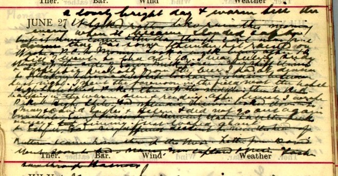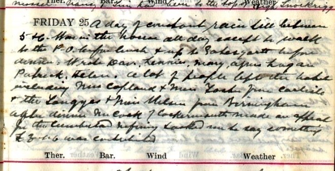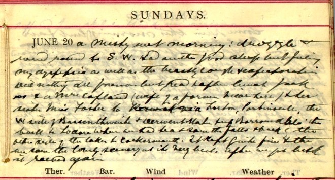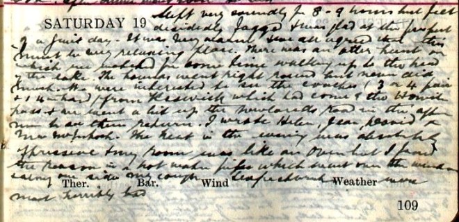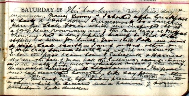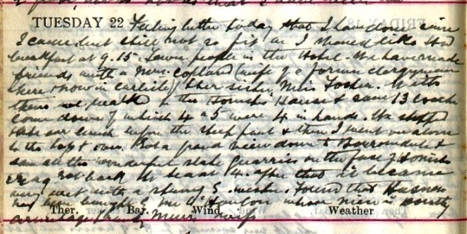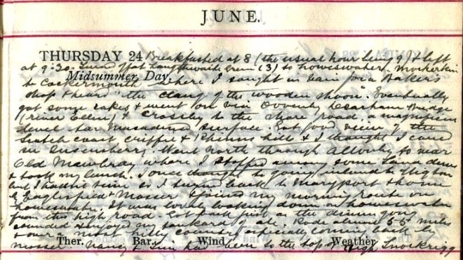 A fine morning + fair up till about 3 when rain came on + fell heavily till nearly 8. I went for a cycle run across Newlands Pass returning by Whinlatter + Swinside = 21.55 miles1. Newlands is a fair road, very steep to the top but summit = 1.33. On the other side a short rough piece + then all the rest rideable except the Devil’s Elbow2. From top to a road that turns off to Swinside it is 5.27 + the whole distance to Braithwaite will be 7. Went round to Portinscale + Braithwaite + then up Whinlatter, a splendid road but steep for over a mile. Had fine views of Skiddaw3 + Bassenthwaite. It began to rain on my way up + I got very wet. Came back by the other Swinside, a rough + hilly road. Nancy + Tim4 walked to Loweswater. Got P.C. [postcard] from the Lady of the Magic Cave!5