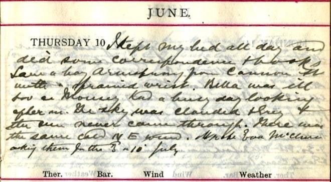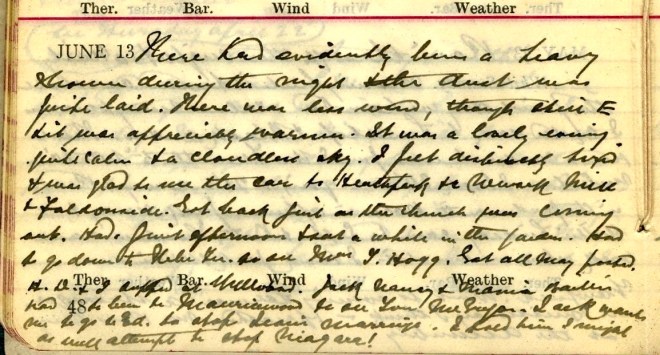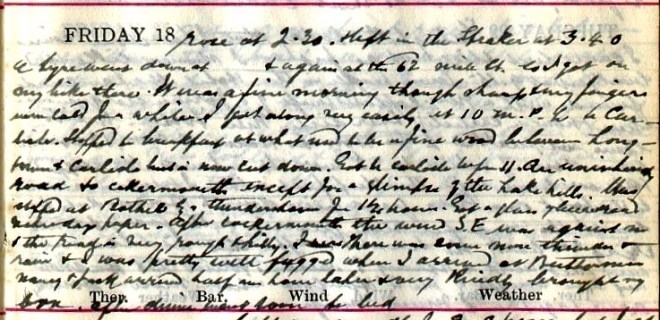Rose at 2.30, + left in the Straker1 at 3.40, a tyre went down at [left blank] + again at the 62nd mile stone so I got on my bike there2. It was a fine morning, though sharp + my fingers were cold for a while, I got along very easily to Carlisle. Stopped for breakfast at what used to be a fine wood between Longtown + Carlisle but is now cut down. Got to Carlisle at 11. An uninteresting road to Cockermouth except for a glimpse of the Lake hills. Was stopped at Bothel3 by a thunderstorm for 11/4 hours. Got a glass of beer and read yesterday’s paper. After Cockermouth the wind S.E. was against me + the road so very rough + hilly. I was There was some more thunder + rain + I was pretty well fagged when I arrived at Buttermere. Nancy + Jack [Roberts] arrived half an hour later + very kindly brought my box. After dinner went soon to bed.