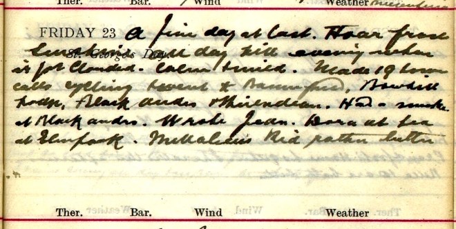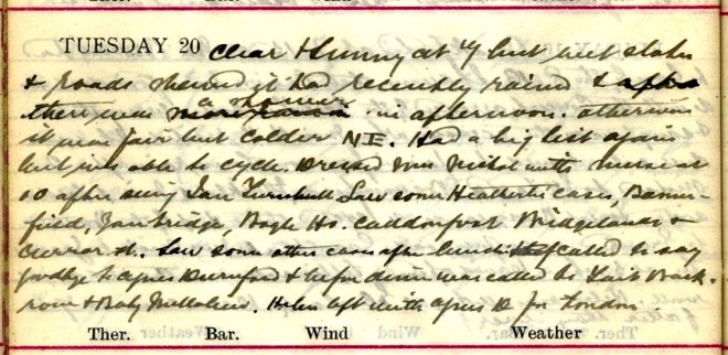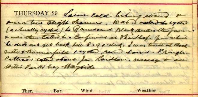 Same cold biting wind + one or two slight showers. David [two words deleted] cycled (actually cycled) to Broadmeadows + Black Andro this forenoon + was then called to a confinement at Shorthope from which he did not get back till 8 or 9 O’clock. I was twice at Rockville + Bannerfield + cycled round town. Pringle-Pattison1 called about Jas. Laidlaw. Message to see Willie Park’s boy [at] Wayside2.