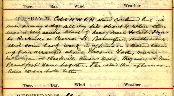 Cold N.W. to N. wind but it was sunny + dry all day till about 4 when there was a very severe blast of heavy rain + sleet. I cycled to Rockville Terrace, Curror Street, Bannerfield, Heatherliebank. Did some book work in afternoon. David [Graham] came up + we arranged about Income Tax, nurse McGilligan at Rockville knows Dora. They were at Miss Proudfoot’s home together. She called this afternoon. Bella [Paulin] + Dora [Muir] both better.