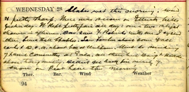 Slates wet this morning. Was N. [wind] pretty sharp. There was snow on Ettrick hills yesterday. It kept pretty fair all day: one or two slight showers in afternoon. Dav. [Graham] saw F Roberts with me. I cycled there [and] Sunderland Hall Stables. Saw Fowler about some Vacc [Vaccination] cards + D.C.A.1 about [illegible] at Clubhouse. Went to meeting of Panel Committee at Gala. All there but Doig + Hiddleston2. Long meeting. Didn’t get back till nearly 7. Snow on Peat Law this morning.