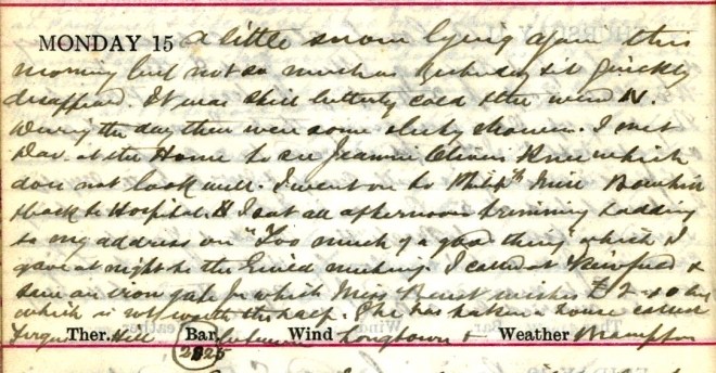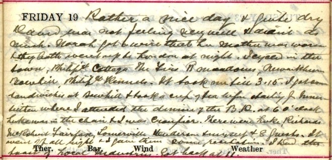 Sharp but very pleasant day + roads good. Motoring saw cases in Heatherlie, Philiphaugh Cottages, Linglie Cottages, Broadmeadows, Newarkmill, + Carterhaugh + Nursing Home. Was in house after lunch + wrote Eddie Miller1, Frank2 + Dora3. Went to evening service. Jack + Nancy4 came to supper. Nancy has been much more comfortable5 since I put on a broad bandage yesterday + I replaced it with a Domette6 one tonight.