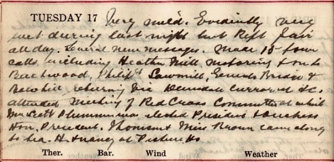 Very mild. Evidently very wet during last night but kept fair all day. Several new messages. Made 15 town calls including Heather Mill motoring + on to Beechwood, PhilipH Sawmill, General’s Bridge + Bowhill returning via Dunsdale, Curror Street +c. Attended meeting of Red Cross Committee at which Mrs Scott Plummer1 was elected President + [the] Duchess2 Hon. President. Thomson + Miss Brown3 came along to tea. H. [Helen] + Nancy4 at Picture House.