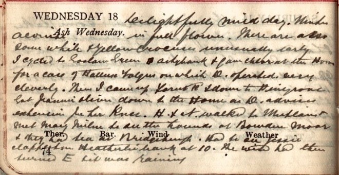 Delightfully mild day. Winter Aconite1 in full flower. There are also some white + yellow crocuses unusually early. I cycled to Goslaw Green, Ashybank + gave chlor[oform] at the Home for a case of Hallux valgus2 on which D. [Dr David Graham] operated very cleverly. Then I came up Forest Road + down to Pinegrove. Got Jeannie Oliver down to the Home as D. advises extension for her knee. H + I walked to Whitlaw + met Mary Milne to see all the hounds at Bowden Moor + they had tea at Bridgeheugh. Had to see Jessie Clapperton, Heatherliebank at 10. The wind had then turned E. + it was raining.