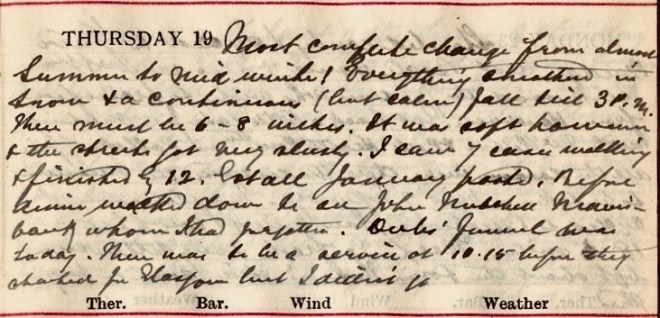 Most complete change from almost summer to mid winter! Everything smothered in snow + a continuous (but calm) fall till 3 p.m. There must be 6-8 inches. It was soft however + the streets got very slushy. I saw 7 cases walking + finished by 12. Got all January [accounts] posted. Before dinner walked town to see John Mitchell, Mavisbank, whom I had forgotten. Dubs’ funeral was today. There was to be a service at 10.15 before they started for Glasgow but I didn’t go.