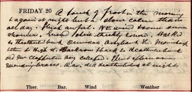 A touch of frost in the morning + again at night but a slow calm thaw all day. Slush awful. N.E. wind + some snow showers. Ground still thickly covered. Walked to Heatherliebank, Dunsdale, Ashybank Lane [?], Mavisbank + then to High Street, Backrow + back to Heatherliebank. Old Mrs Clapperton very collapsed. Spent afternoon mending braces. Dav. [David Graham, co-partner] did Heatherliebank at night.